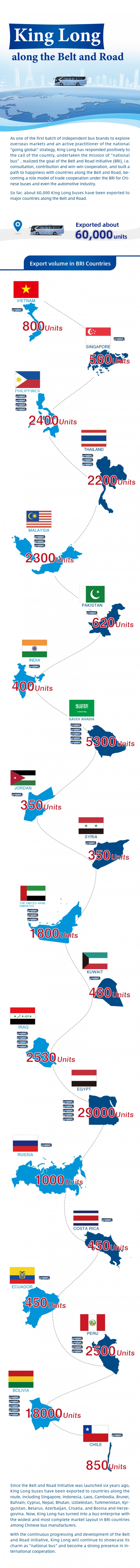 As one of the first batch of independent bus brands to explore overseas markets and an active practitioner of the national "going global" strategy, King Long has responded positively to the call of the country, undertaken the mission of "national bus", realized the goal of the Belt and Road Initiative (BRI), i.e. consultation, contribution and win-win cooperation, and built a path to happiness with countries along the Belt and Road, becoming a role model of trade cooperation under the BRI for Chinese buses and even the automotive industry.