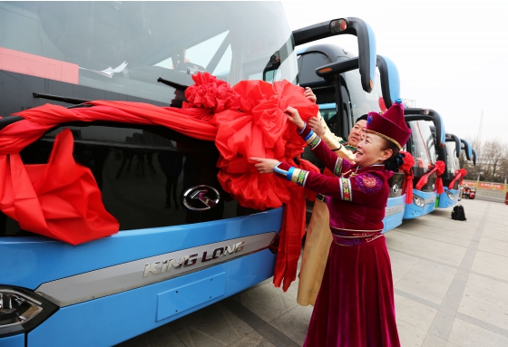 On January 21—a -8°C winter day, little snowflakes were falling from the sky. Despite the cold weather, members of Ulan Muqir troupes were so excited about the incoming coaches specially procured for them. The artists, all dressed up in gorgeous ethnic costumes, were joyfully waiting on Ulan Chiat Square, Hohhot for the delivery of coaches customized by King Long.