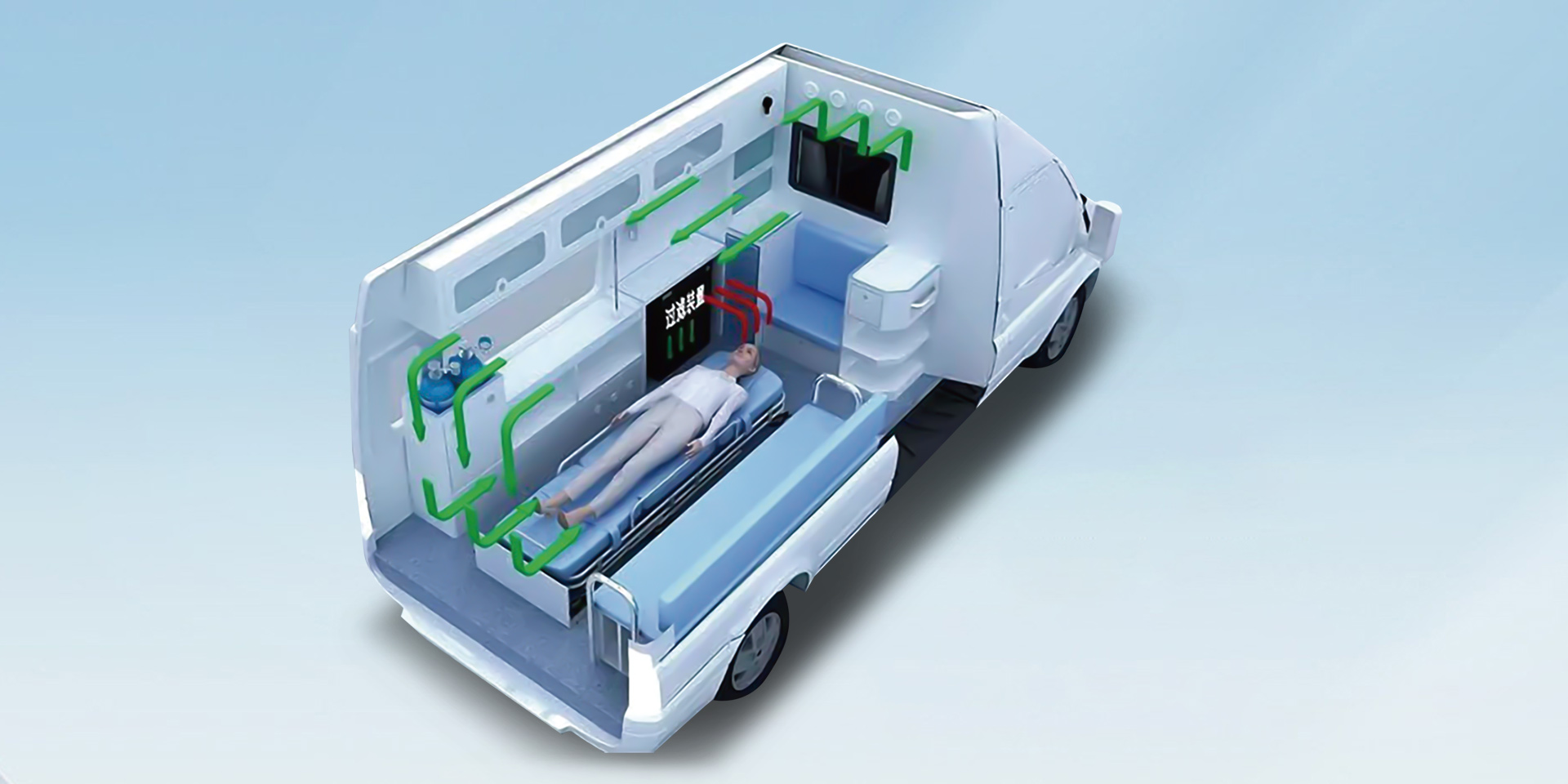 Intérieur d’ambulance entièrement équipé, offrant des soins professionnels et garantissant sécurité et confort en tout temps.Espace de traitement et d’isolation sécurisé, veillant sur des vies en tout instant.